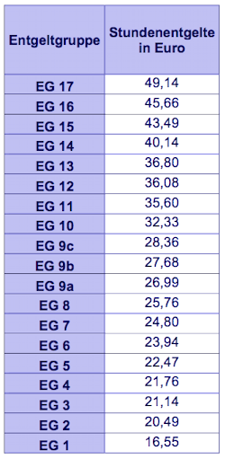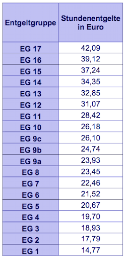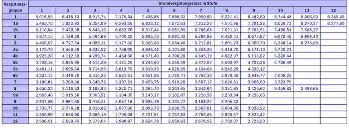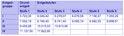 Tabellenentgelt für Mitarbeiter in Vergütungsgruppen (in Euro)
