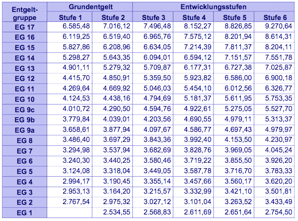 Tabellenentgelt für Mitarbeiter in den Entgeltgruppen (in Euro)