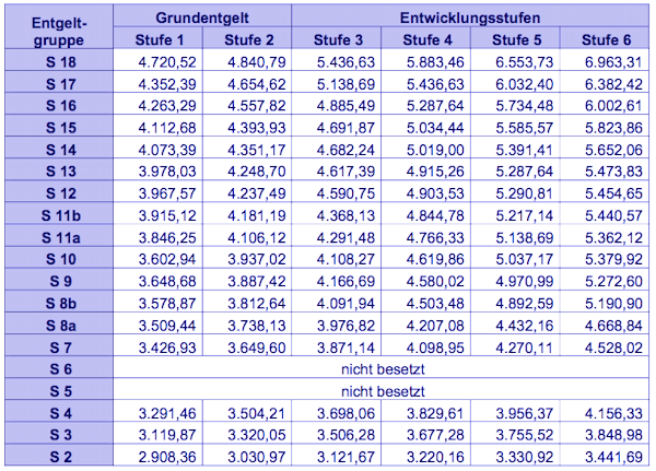 Tabellenentgelt für Mitarbeiter in den S-Gruppen (in Euro)